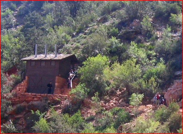 We sat down and chuckled at the crazy design that had steps going up to the rest house. Once again, we passed on the public restrooms as too hard to reach and pretty much unnecessary. I peed at TipOff Point some eight or nine hours ago, and skipped the ones at the river and Havasupai Gardens. No need for any other details. It was a relief (ha!) to know there are public restrooms along the way. Did I mention they were clean? Ate my final pickle, drank a bunch of Tailwind, and refilled only my 24-ounce CamelBak bottle — no need to fill and carry more weight in my two (now-empty) one-liter bottles at this point. Our next stop would be Maswik Lodge, our Juniper hotel room, and a twelve-pack of Modelo Light beers in the fridge. Oh, happy day!