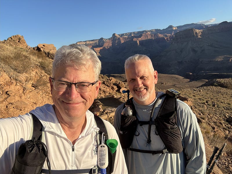 Three months after surgery, my buddy Mike started teaching me to hike. In the spring and summer of 2025, Mike took me on harder and harder hikes, taught me how to choose and use gear, and patiently encouraged me to push forward. By fall, I was hiking almost as strongly as he was. Sadly, the third man in the ring, our dear friend Chris, who is like a brother to us, had hoped to hike the canyon too, but had to pull out early in the planning phase with back surgery. We certainly missed him dearly. Maybe next time?