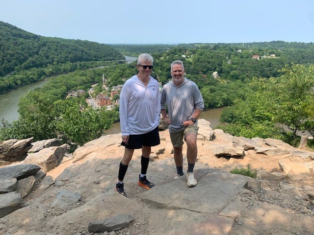 And of course, we hiked. I think we did nine increasingly more difficult training hikes culminating in a 16-mile, 4,600-foot elevation hike in Harpers Ferry, West Virginia, three weeks before the Rim to River. Four times up Maryland Heights, a thousand feet climb over two miles, in the heat (and back down, of course). We also knocked out a 21-mile “walk” in 90+ degrees and high humidity, in July, to get time on our feet and more experience with hydration strategies.