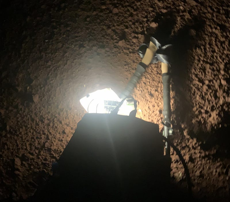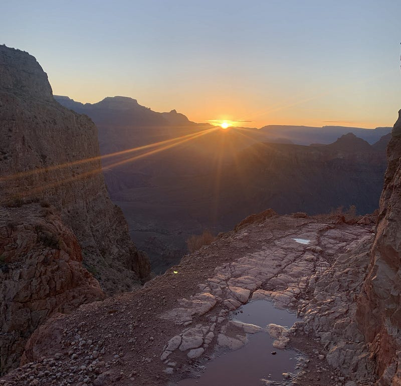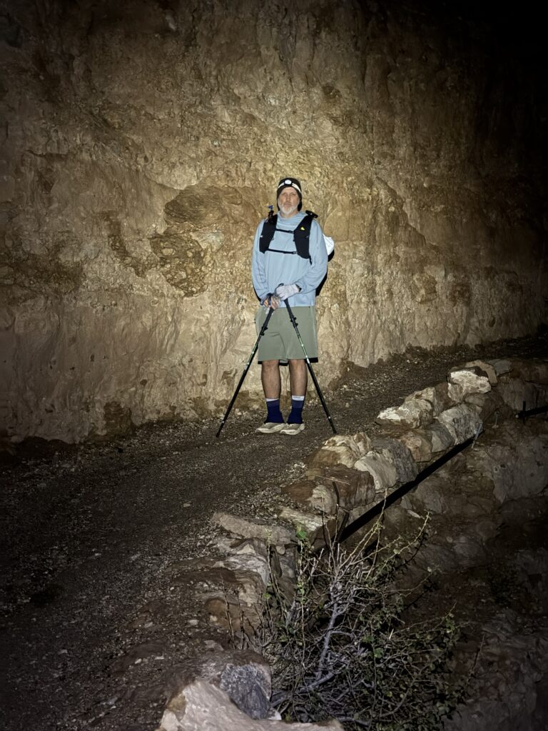 We reach the famous upper tunnel and stop for selfies. We know we got this, and we allow ourselves to fully acknowledge it. The legs are heavy, the shoulders sore from our packs, but it’s relatively flat here, and though weary, we are excited. All the work and miles we put in over the months were worth it — our obsession with the logistics and planning paid off. All of the things I lost sleep over, and most of the trail, were behind me. How scary would it be to hike in the dark and cold by headlamp at the start? Would I stumble and fall off a cliff? How hard would it be if the heat were unbearable? What if we ran out of drinks? Twist an ankle? Just plain old exhausted, and we have to overnight to recover before hiking out? Massive cardiac? I had run through all of these in my mind over months and months, and had mitigation plans for them, too. None of the catastrophes happened. Uncertainty answered. Just a proud, earned exhaustion.