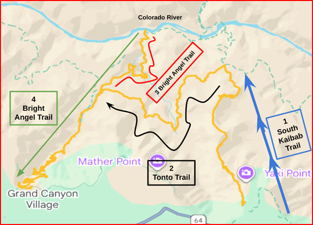 Tonto Trail, linking South Kaibab and Bright Angel, didn’t get much attention until the River Trail closed for construction and the North Rim burned down, wiping out R2R plans for all.