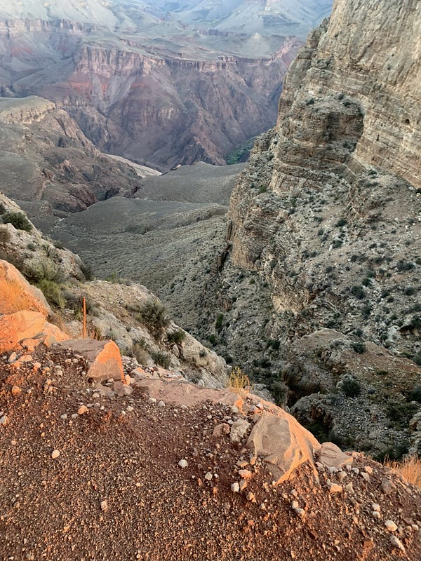 Our goal was to make it all the way to the Colorado River in the best shape we could for the eight-mile climb out later in the day. We had a plan to stop hourly, and my watch was set to alert us to take a short break, drop the pack, eat and drink a little on schedule, stretch, and then resume our hike after 5–10 minutes. We were going to be disciplined. The first time my watch beeped, we dutifully found a flat and wide section and took the prescribed rest break at 5:04 am. (I even took a death-defying pee over the edge, wondering if my ex-hotel coffee would trickle down onto the switchback trail below, and I’d have to walk through that later. Eww.)