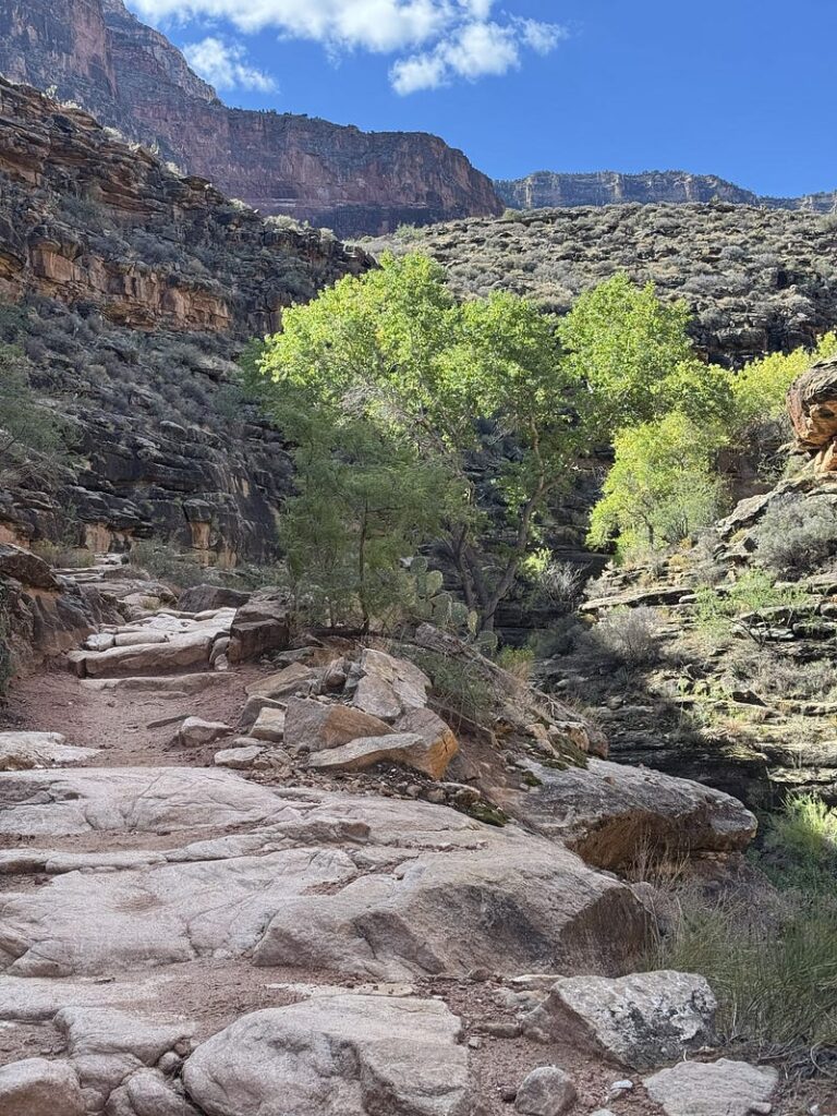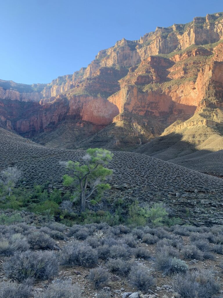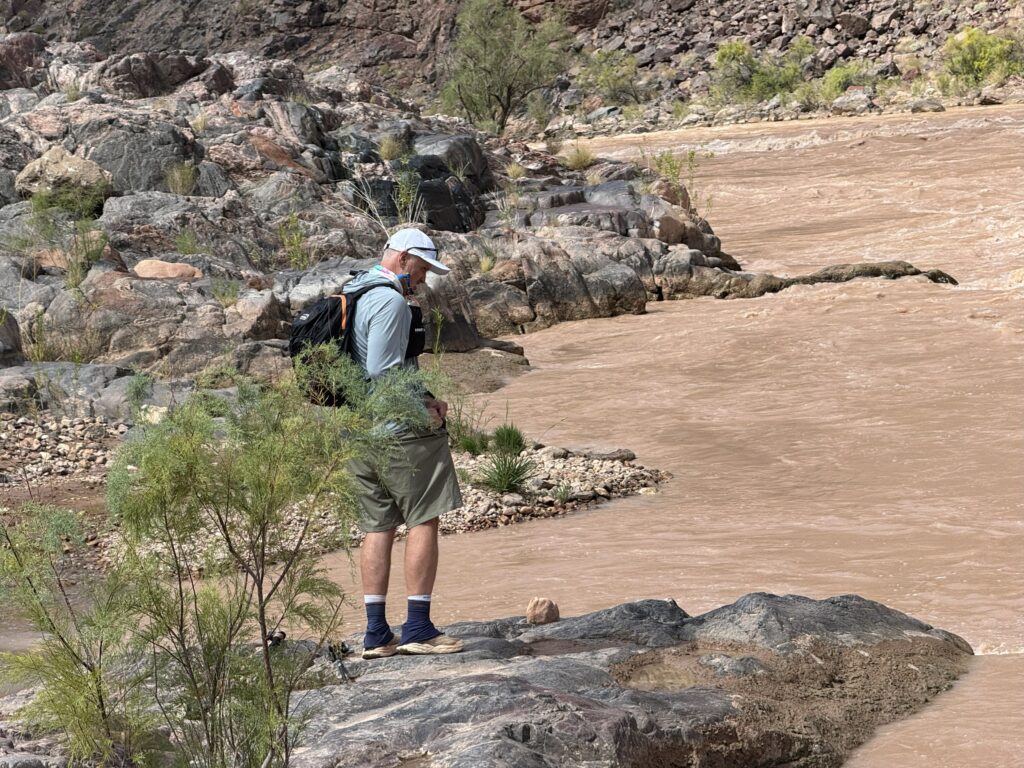 The Tonto Trail — Bright Angel Trail junction (our next milestone) is lush along Garden Creek, where many hikers were congregating, sitting on rocks in the shade, and gathering themselves for the next leg up or down. We enjoyed a fair amount of camaraderie again and downed more food and drink to sustain ourselves for the journey to the river. Stretched a little. Took some photos. Tried to send phone messages unsuccessfully. My iPhone satellite messaging couldn’t find the satellites here. We shouldered our packs and began the descent to the River.