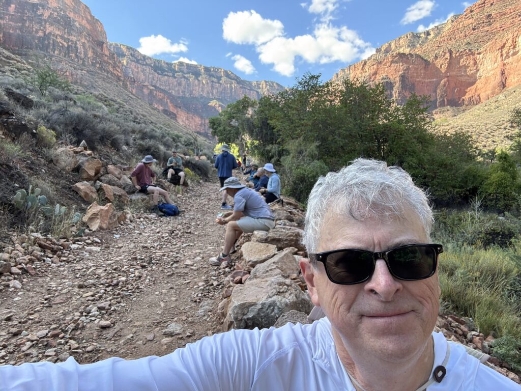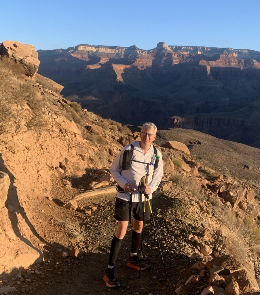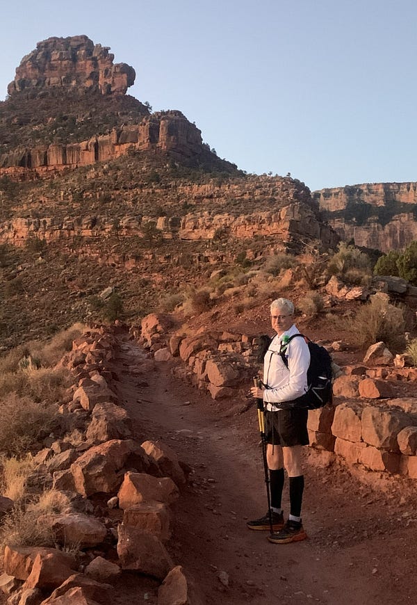 But running ended completely in late 2023, and after a year of limping, I had the offending joint replaced in December 2024. Rehabilitation went extraordinarily well thanks to my physical therapist, Paul, the Knee Whisperer, who knew I wanted to hike the Grand Canyon and pushed me hard and successfully to recover. Two months after surgery, I was surfing the Grand Canyon R2R Facebook page, swapping questions and concerns with other knee replacement old timers, hoping to hike the canyon. Those people could not have been more helpful and inspirational. Some had both knees replaced and were all in!