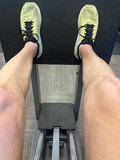 My physical therapist had me on a good regimen, not just for the knee but also for my core, balance, and strength work in the gym three times a week, maybe an hour at a time. Every other day, I did the Stairmaster in some form: three to five sets of 5 minutes each, with 90-second breaks. Eventually got that up to 20 minutes nonstop. Once a week, I’d walk backward for 30–45 minutes on an inclined treadmill to beef up the quads, as I had learned from the Facebook R2R group. I found the backwards treadmill thing to be a chore — it takes a lot longer to get the legs burning than the Stairmaster, and it was boring without a TV monitor to watch, and now I was staring at all the people on cardio machines, staring back at me. I didn’t do this as much as I should have. That said, as I mentioned when we hit bottom (of the Canyon, not physically or mentally) I felt no pain at all in the quads, even though I didn’t work on them as hard as I had hoped.