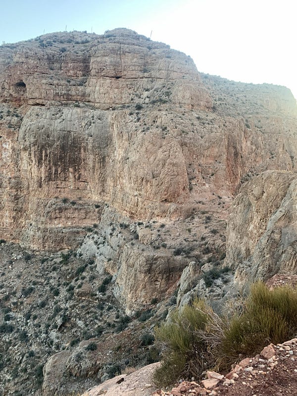 GEAR CHOICES. There were lots of recommendations on the Facebook hiking pages about gear, and I learned a lot from Mike. Some equipment is critical, some is a personal choice, and what makes you feel comfortable and ready, and some is just plain useless. I was comfortable with my choices for the most part. Hoka Speedgoat 5 GTX shoes. Osprey 22 pack. Montem poles. Garmin Fenix 7 Solar watch. Wright Socks (double layer). Cheap but effective shorts and shirt (found a rare SPF hoodie with a ¼ zip to vent when it got warm!). Katadyn BeFree filter. My iPhone satellite text messaging worked deep in the canyon except at the Colorado River because of the cliffs. At the end of this novel, there’s a separate fun addendum about gear, hacks, and tweaks, but I will say I was tremendously pleased with my gear selection and how it all worked.