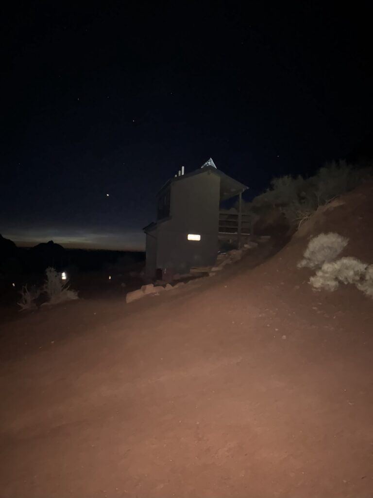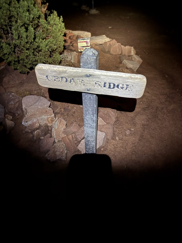 We shouldered our backpacks on time and resumed our hike. Probably after literally no more than 10–20 feet, we rounded a bend….and our headlamps lit up the Cedar Ridge rest area (below), with bathrooms, a place to sit, and far nicer than the standing-up, ad hoc rest area we just left. We laughed so hard at how close we were and had no idea. It was a good time. The first of many.