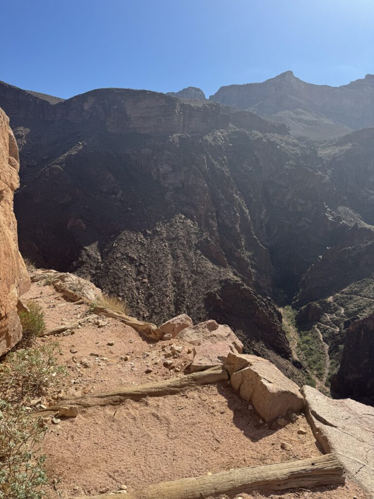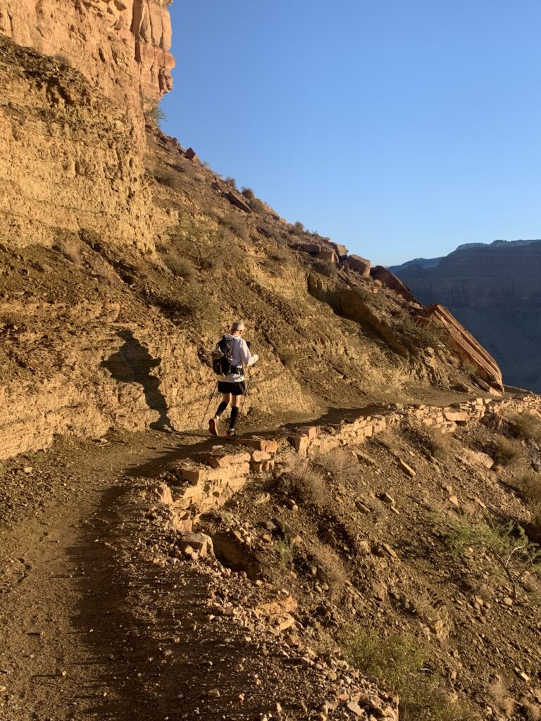 I thought this kind of path was only on the North Kaibab Trail and no longer a threat since we weren’t doing Rim to Rim. Did I mention I hate heights? Months earlier, I had even checked in with a sports psychologist to handle the North Kaibab cliff better when I thought we were doing R2R. I was spending every waking moment wondering how I would get through that section, a real downer during training, and I didn’t want to do that anymore. I also wanted coping techniques to talk myself through that frightening section once I got there. I was relieved to give all that anxiety and countermeasures up when the North Rim closed. And here was an almost identical, dangerous-looking precipice again on the south side. Worse, this section must be done twice, once to get to the river and once to get back up. If it sucked descending, there was no choice on the return.