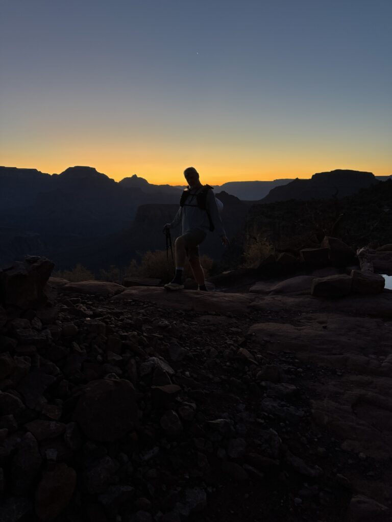 Mike and I had spent months planning, overthinking, and preparing for the Grand Canyon hike, and we were hyper-organized. I even had a checklist: sequencing stuffing my backpack with prepared supplies, taking a quick shower to clear my head, dressing, hitting the coffee pot’s start button while I retrieved cold food and drink from the hotel room fridge, packaging them with a small baggie of ice in a small thermal lunch bag, and putting it in the top of the backpack, and donning my cold weather hat and gloves, headlight, trekking poles positioned in front of the door, and at exactly 3:25 am stepped outside to meet Mike. All on the checklist. Well, I stepped out into the glare of the taxi’s headlights approaching, heard my hotel door shut, and realized my coffee was still in the coffee maker. First fail. Back inside quickly and in the cab at 3:30 anyway. With coffee. Almost like the dispatcher said.