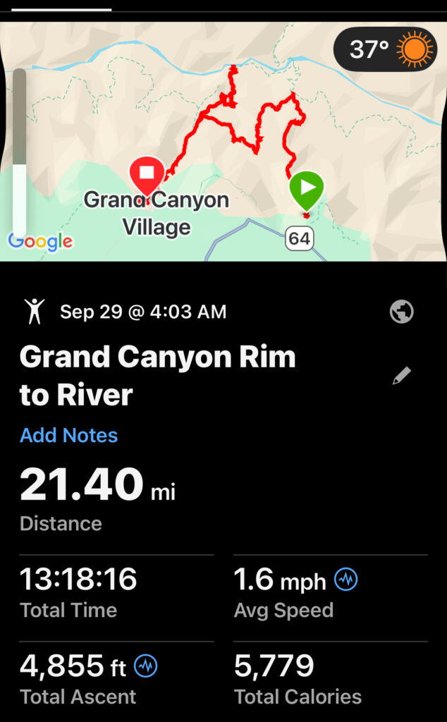 On Monday, September 29, 2025, Mike and I set out to hike the Grand Canyon Rim to River; South Kaibab-Tonto-Bright Angel trails to the Colorado River, and back up Bright Angel to the South Rim. (Spoiler alert – we did it.) My Garmin GPS watch says 21.4 miles in 13 hours, 18 minutes. We started at 4:03 am and enjoyed weather that was maybe 10 degrees cooler than usual — a blessing. Our original plan was a genuine “Rim to Rim” (R2R), down one side, across the canyon, and back up the other. When the North Rim burned down in July 2025, closing the northern trails, like so many hikers, we changed to Rim to River rather than not hike the Grand Canyon at all.