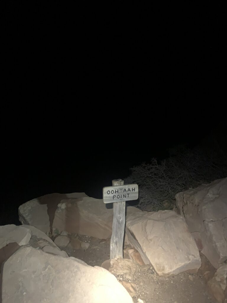 We passed “Ooh Aah Point”, a supposedly scenic overlook about a mile and a half down where folks enjoy sunrise, but it was 4:40 am, and all we saw was darkness — lots of it. The mile after “Ooh Aah” was the steepest descent of the hike — 859 feet down. I learned that later from my Garmin watch, since in the dark it was just…down.