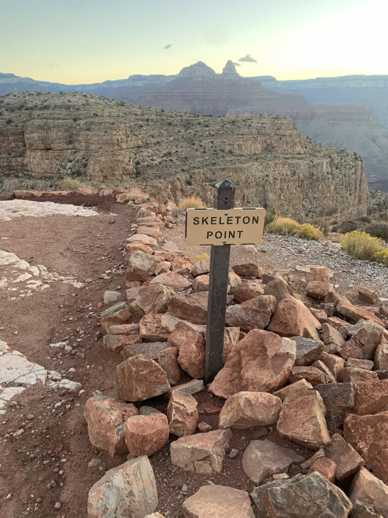 We passed Skeleton Point, about three miles down, at 6:20 am, and by 7:30 am, we were at “The Tipoff”, our second milestone. Tipoff is a real rest stop about 4.5 miles down the South Kaibab Trail, with a small seating pavilion and more toilets. This time, unlike Cedar Ridge, we sat down with packs off. I took in some real food — an “Uncrustable” PB&J, some pickles, and a few swigs of Gatorade. Mike again marveled at how clean the bathrooms were, especially in such a remote location. I enjoyed them, too. Kudos to the park rangers or the contractors who must have come in by helicopter or burro to clean them. We joined Team Omaha in the small pavilion, along with a few other hikers who had started after us. I used satellite messaging on my iPhone to give my wife and kids an update that we had made it this far and to swap some heartwarming, encouraging messages—the best refueling of all.