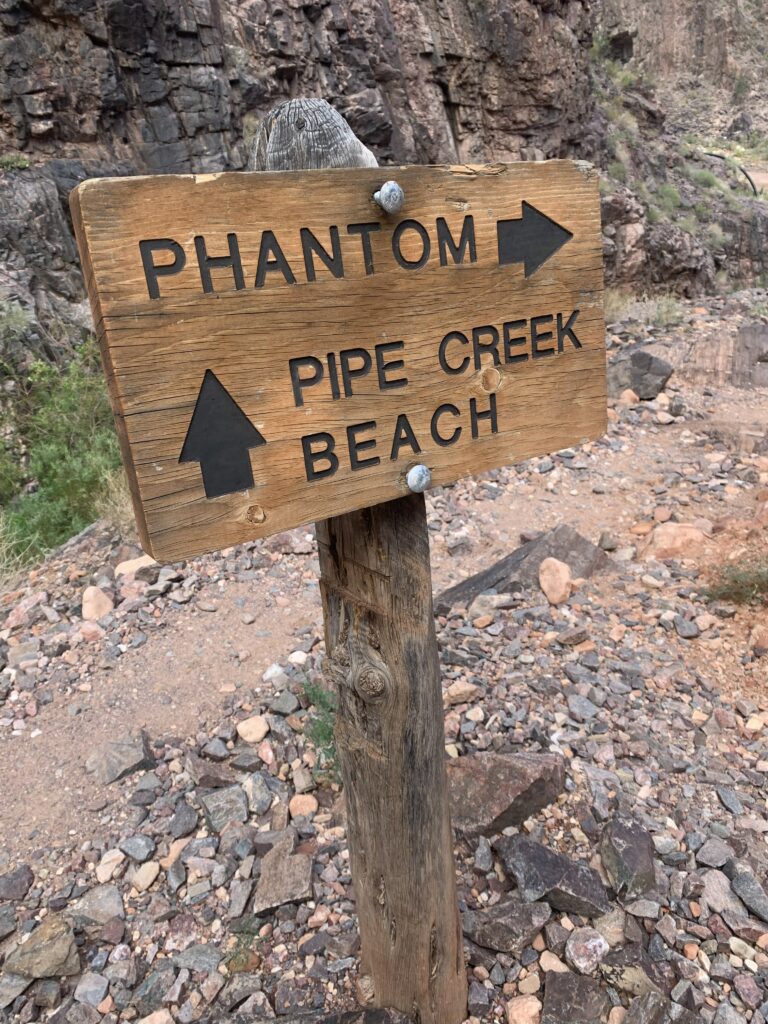 Finally, the Colorado River about 11:30 am. A relief. A big accomplishment. Maybe halfway done the whole hike, not by distance, but mentally. We made it 13+ miles down over about seven hours with nothing untoward happening, feeling a little tired and a little achy, yet in great spirits, knowing we had reached a major milestone in good shape. We weren’t cocky at all, and yet our confidence was growing: while we had the most challenging part yet to come — an eight-mile hike up 4,400 feet (I had paid attention to that!) — we did what we wanted — got to the river healthy and in the best position for the climb out. Quite surprising, we had read for months on the R2R Facebook page how unexpectedly beat up everyone’s quads were after the descent, and neither of us had any undue discomfort at all — tremendous relief at that.
