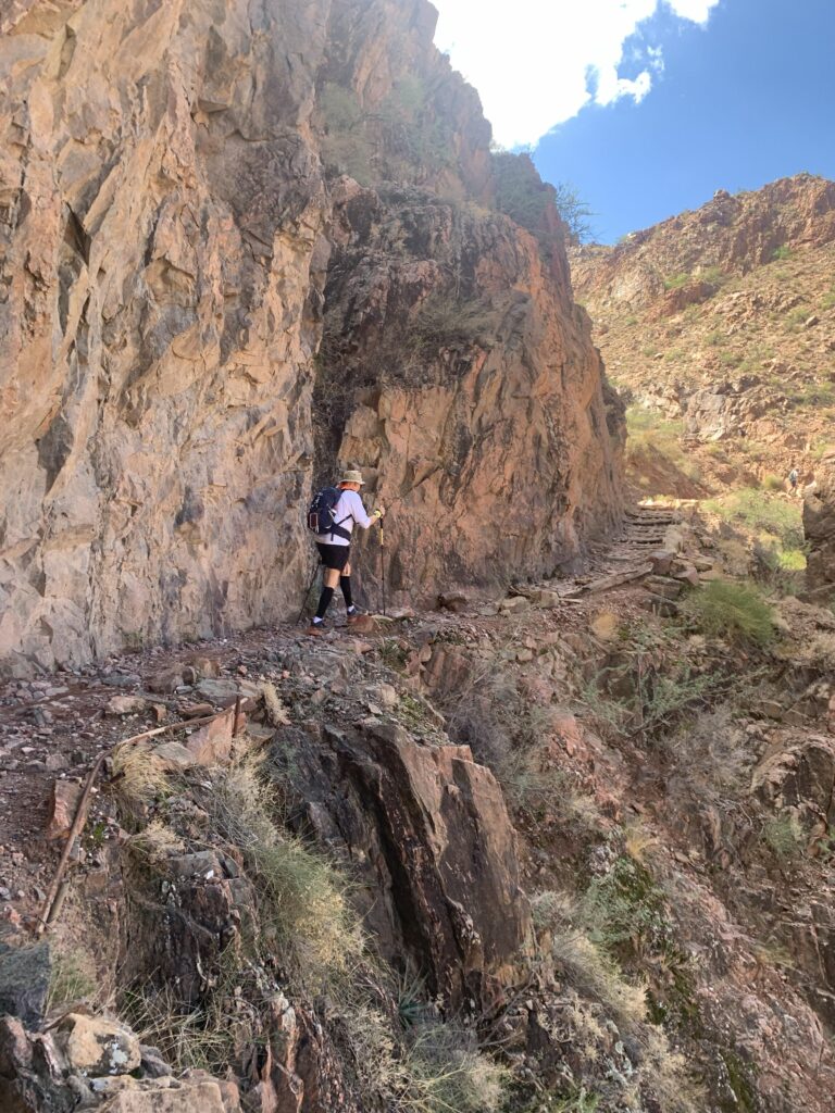 Mike said the next challenge was called the Devil’s Corkscrew, a name I hadn’t paid attention to, and maybe that was best. Devil’s Corkscrew, as I recall it, was the third of four sections down Bright Angel from the Tonto Junction, the first being a not-too-difficult trail with some rocks and ruts along Garden Creek, leaving me with a false sense of comfort that getting to the river will go fine. The second got my attention. The trail was carved out of a canyon wall, maybe eight feet wide, with, I’d say, an easy couple of hundred feet of sheer drop to the bottom without even some small boulders along the edge of the path to keep you honest.
