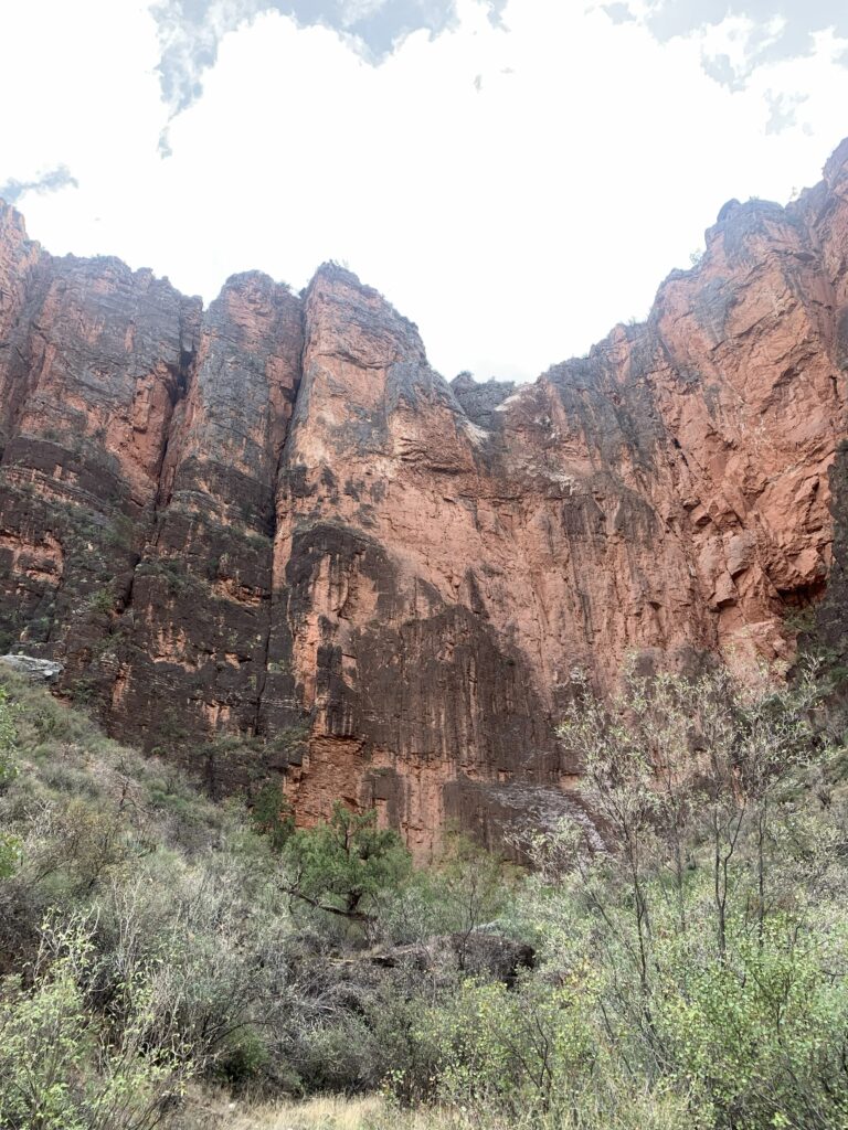 I wasn’t happy at all and summoned much focus when we hit that section. It’s only a hundred yards long (or 200?). My imagination for months had me picturing an unexpected stumble, an ankle twist, feeling dehydrated and woozy and unstable, and plummeting over the edge to the bottom. Never mind, as far as I can tell, no one ever has. I’d be the first. I zeroed my eyes in on the junction of the canyon wall and the path, reminded myself I was steady and strong, and hummed “Amazing Grace” on my way in. Fascinated with a small length of pipe embedded along the edge, Mike veered that way, wondering what it was for, and I interrupted with, “Not now, Mike. Really?!” He was kind and apologetic, and a few yards later did a minor stumble himself on a rock. Not even close to the edge. He wasn’t fazed at all, but it confirmed to me that it could happen. One stumble sideways……