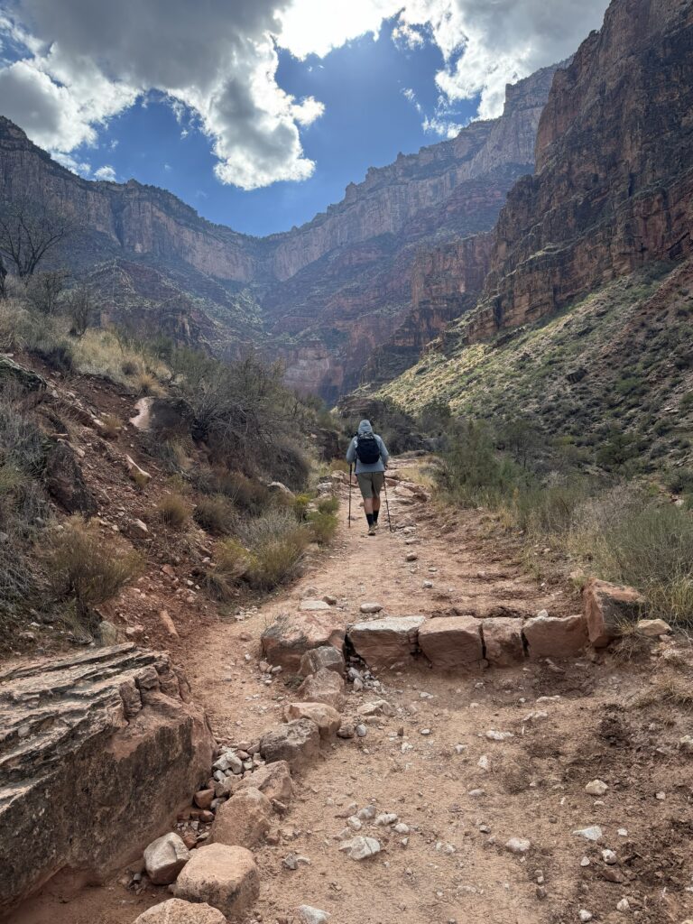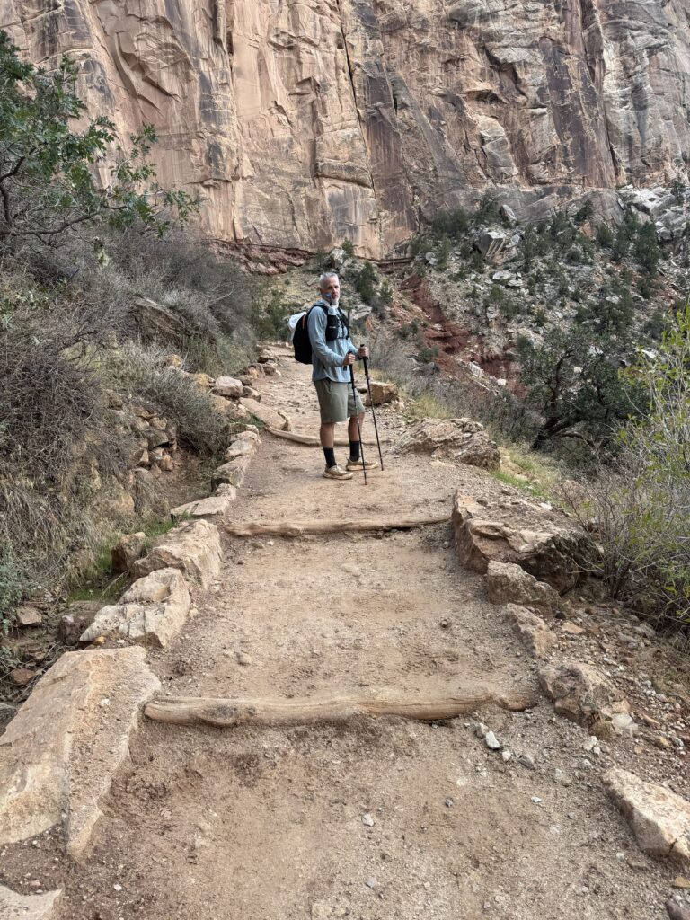 Get a Mike. The best thing I did was pick a hiking buddy who was more fit, healthier, younger, more experienced at hiking and gear, more positive, and as determined as I was to complete this hike. It helps if he is a lunatic who can be funny and talk (and listen) for hours on end. My lifelong friend Mike is all that. We booked this as a Rim-to-Rim hike long ago, pending my recovery from a total knee replacement in December 2024. Mike picked me up from physical therapy, did short recovery walks in winter, and introduced me to hiking in the spring. He’s been a hiker for years. He taught me about gear and technique, and led me on increasingly more difficult and challenging training hikes through the summer. Years ago, when I had to give up running, I concocted a solo Rim-to-Rim hiking plan before I ever knew Mike was interested in doing it too. I cannot imagine how I would have done it without him now. Find yourself a Mike to hike. Or be the Mike to someone else.
