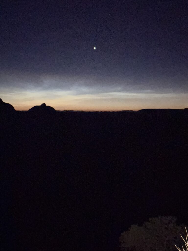 We continued down the trail with no problems, taking a few photos along the way, and soon, in the distance, there was a hint of gray and sunrise just after 5:15 am. Not enough light to ditch the headlamps until just before 6 am. And with that came tradeoffs. No more angst over hiking in the dark, but now I could see the trail downward and the cliffs. The vastness of the Grand Canyon was awe-inspiring and never bothered me. Falling to my death did. But finishing this darkness segment of the hike was an accomplishment and my first milestone. No unexpected problems yet.